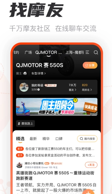 大神帮选车、结伴骑行、车型讨论、新手答疑、摩界热点等多个摩友圈。你可以在这里聊车、聊装备、聊兴趣。也可以自己创建圈子与小伙伴们一起,共建美好家园。
