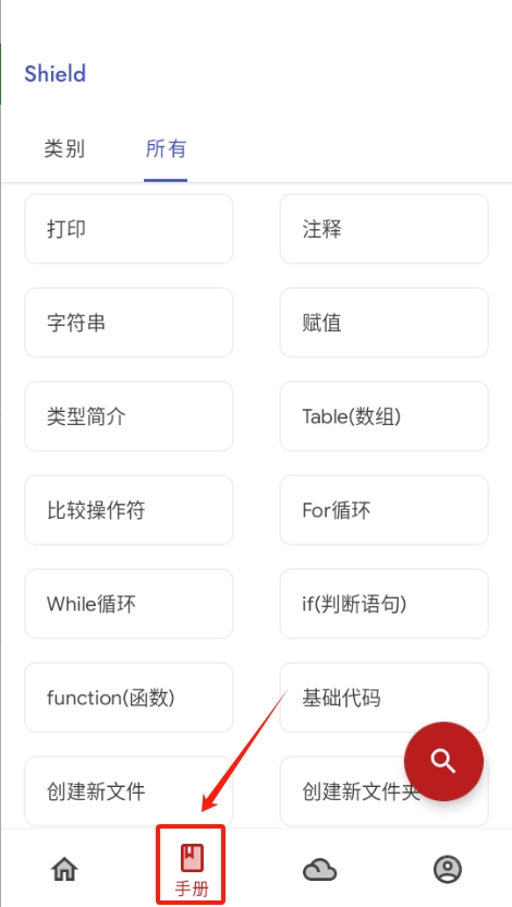 如果是编程初学者,对代码编写还不太熟练,shield还提供了很详细的手册,直接点击底部第二个图标“手册”即可查看。