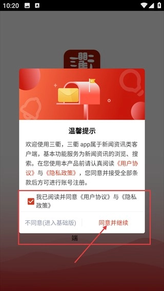 进入【三衢】后,勾选已同意【用户协议】与【隐私政策】,点击【同意并继续】,就能进入软件并准备进行账号注册。