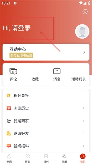 进入【我的】页面后,会看到【Hi,请登录】的提示语,该页面还设有【互动中心】【评论】等功能模块,点击登录区域即可触发登录流程。