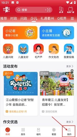 进入【三衢】首页后,能浏览【小记者】【小主播】等功能模块,点击底部导航栏的【我的】选项,即可进入个人中心页面。