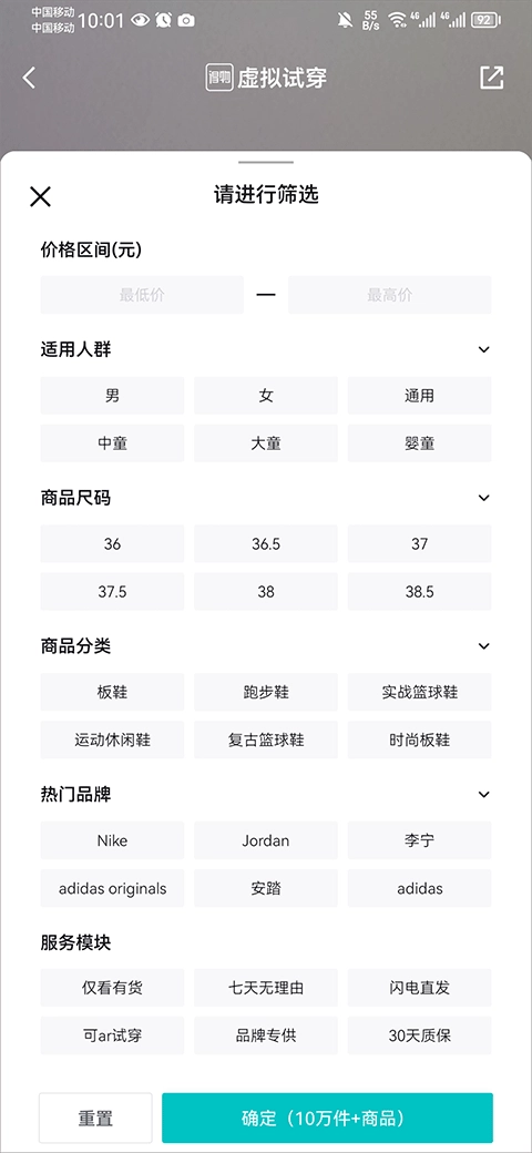 点击录屏右侧的筛选按钮,还能依据价格、品牌、尺码、类型等条件来筛选合适的鞋子。