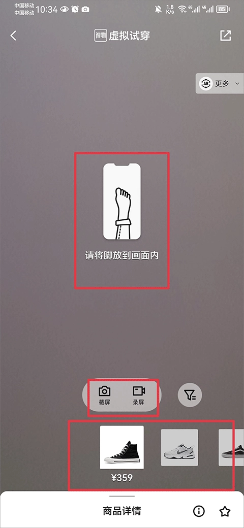 接下来在虚拟试穿的界面里,把脚放进画面中,接着通过下方的左右切换功能来试穿不同鞋子,要是觉得满意,就能进行截屏或者录屏操作。