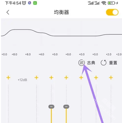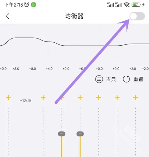 3、进入均衡器页面,点击右上角开关,打开开关。