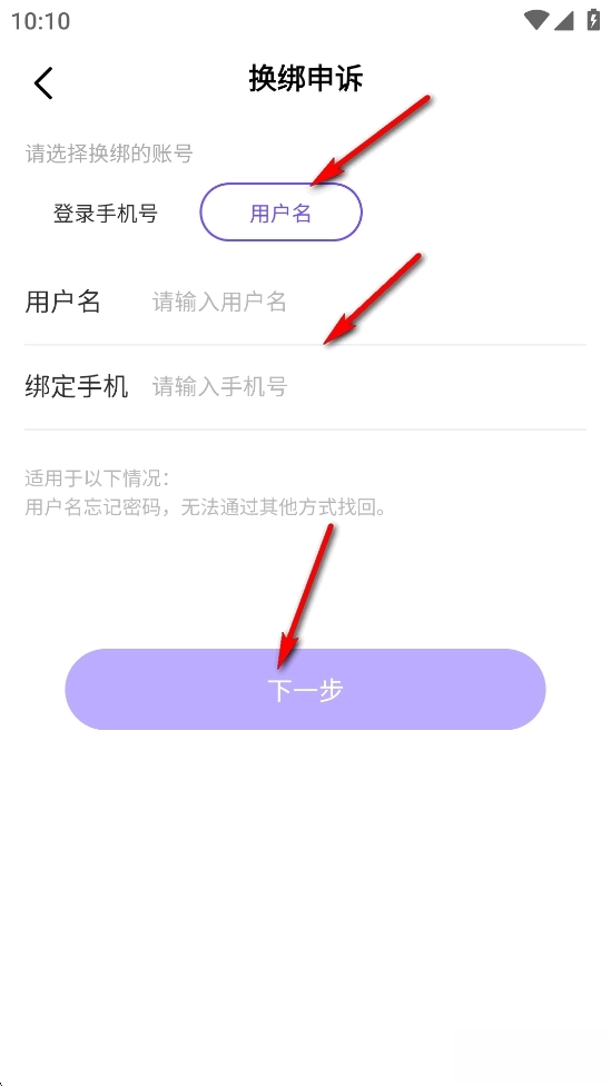 点击【用户名】,输入用户名与手机号,再点击【下一步】完成验证登录流程。
