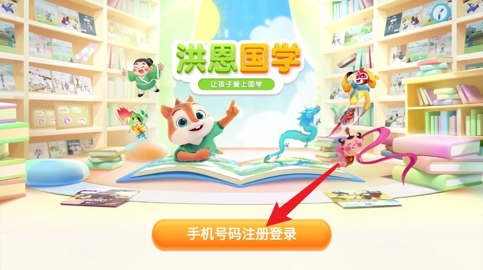 1、进入首页后,点击底部的手机号注册登录按钮,就能开启洪恩国学的趣味学习之旅啦。