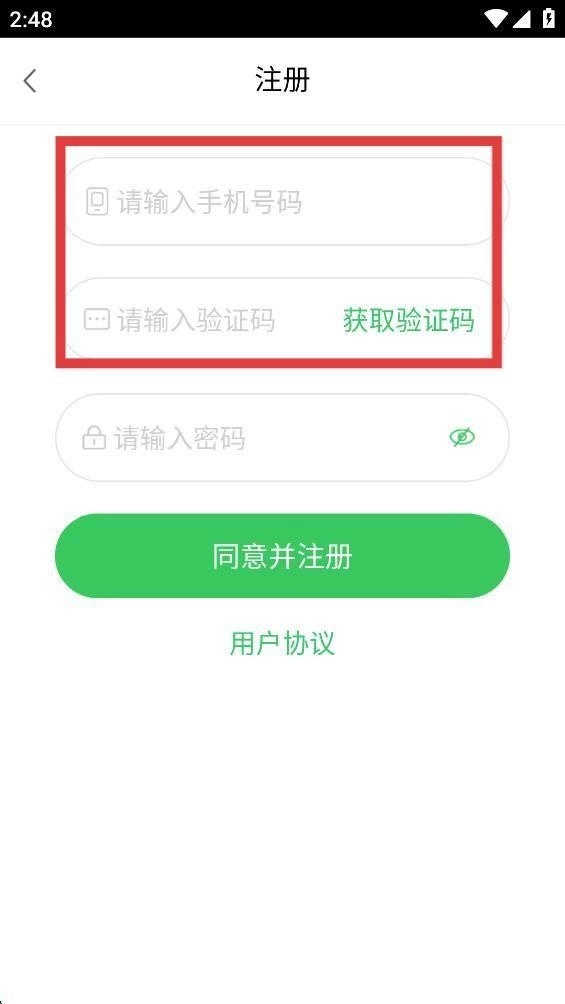 2、在注册页面的输入框里填写手机号码以及收到的验证码。