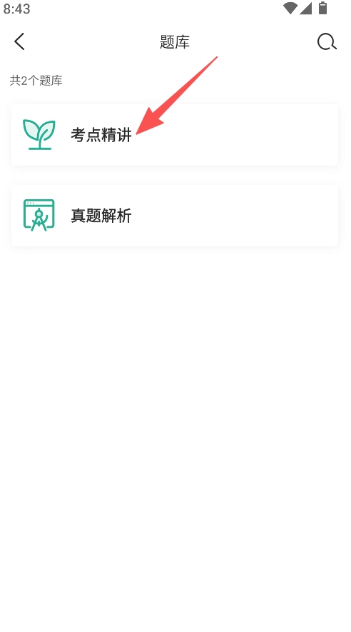 1、启动软件后进入题库板块,查看考点精讲与真题解析这两个选项。
