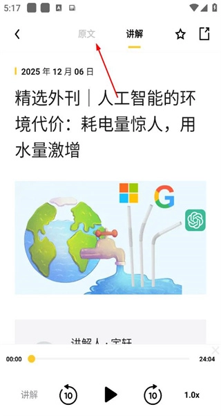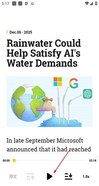 4、在原文视图中点击播放按钮,即可开启外刊原文音频的播放,同时开展听读学习。