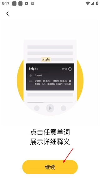 2、进入单词释义引导页,熟悉点击单词查询释义的功能,点击继续即可进入外刊内容页面。