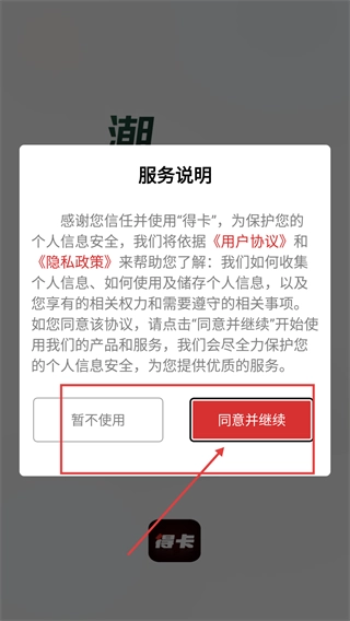 1、在【得卡】的【服务说明】弹窗里,点击【同意并继续】按钮就能进入软件主界面,选择【暂不使用】的话就会终止当前操作。