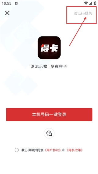 3、进入【得卡】的登录选择页面后,既可以选择【本机号码一键登录】,也能够点击右上角的【验证码登录】来切换登录方式。
