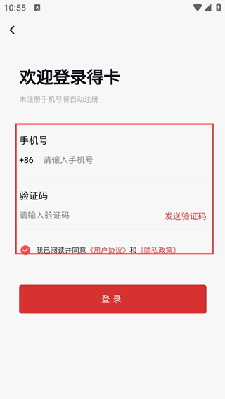 4、进入【欢迎登录得卡】的验证码登录页面后,在【+86-请输入手机号】的输入框中填写手机号,点击【发送验证码】按钮并输入收到的验证码,勾选相关协议后点击【登录】按钮。