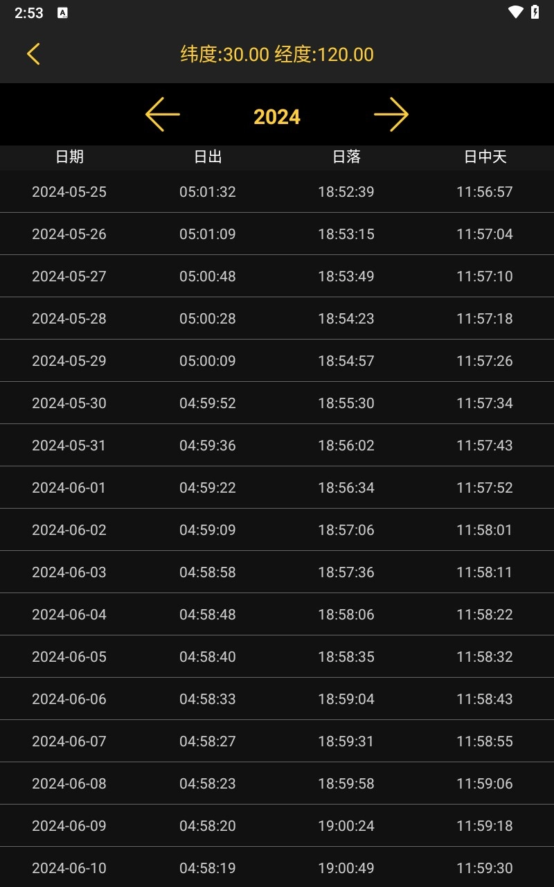 2、然后就能看到当日的日出日落时间