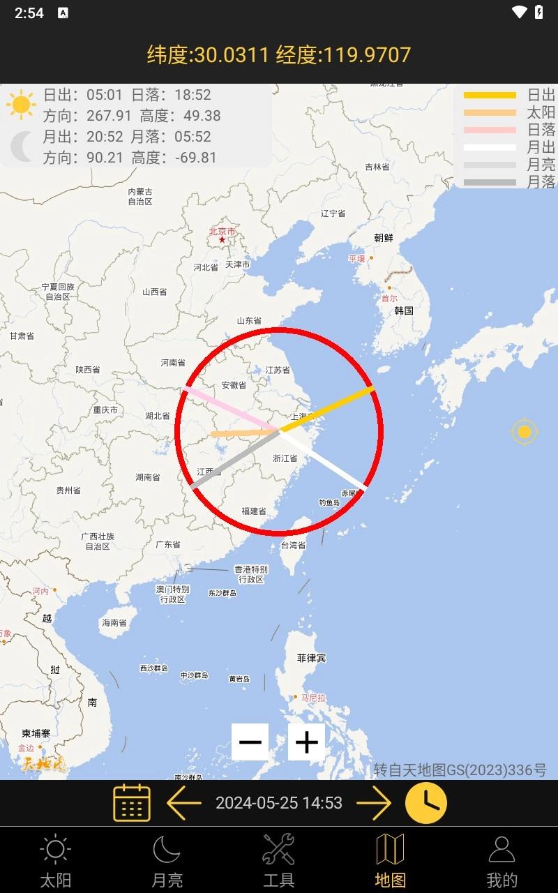 5、地图界面可以查看当前位置的日出日落时间
